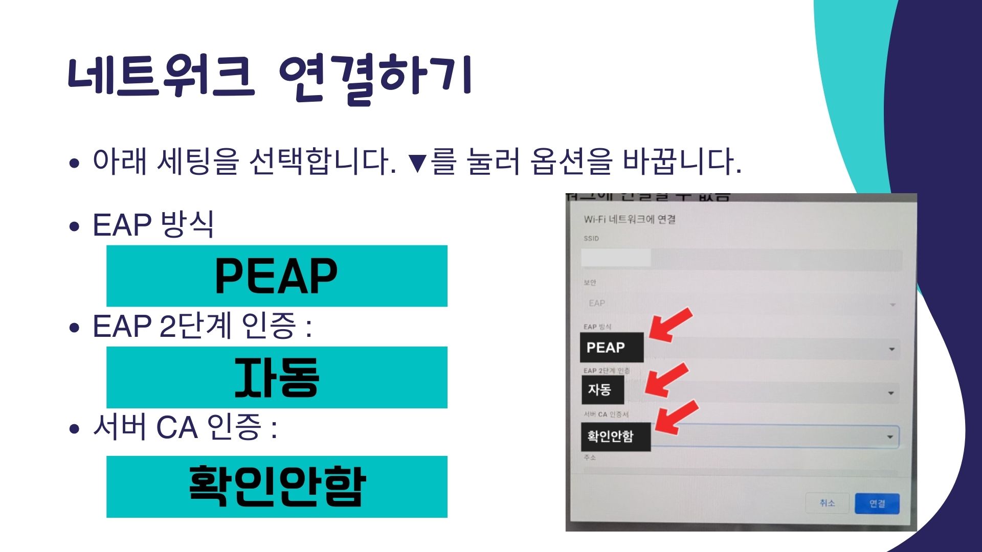 학교 세팅이 이미 되어 네트워크는 자동으로 넘어갈 수도 있습니다.